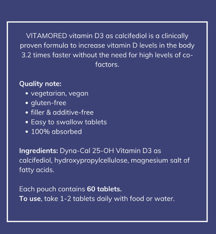**Please note**: Each country interprets the research on the potency of Calcifediol differently. Vitamin D Potency is defined in International Units (I.U.). The form of Vitamin D in VitamoreD (Calcifediol, also known as Calcidiol or 25-hydroxy D3) in research has shown that it can be between 3.2 to 5 x more potent than cholecalciferol due to how it works and activates in the body.
